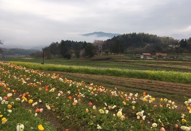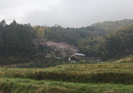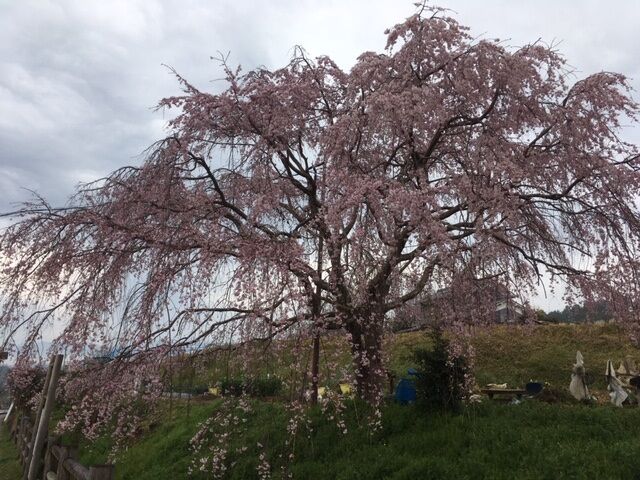 後ろの個人の畑に植えられている枝垂れ桜がほぼ満開になりました