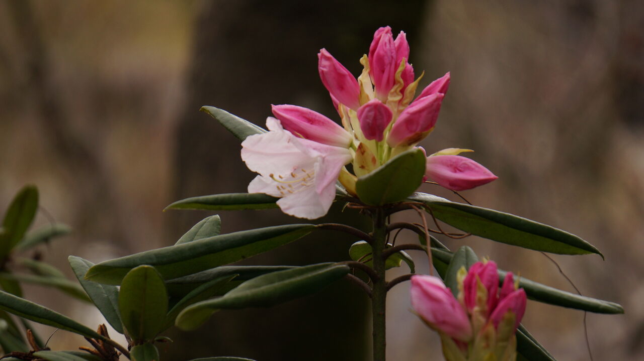 池の周りの石楠花は早くも咲き始めてる