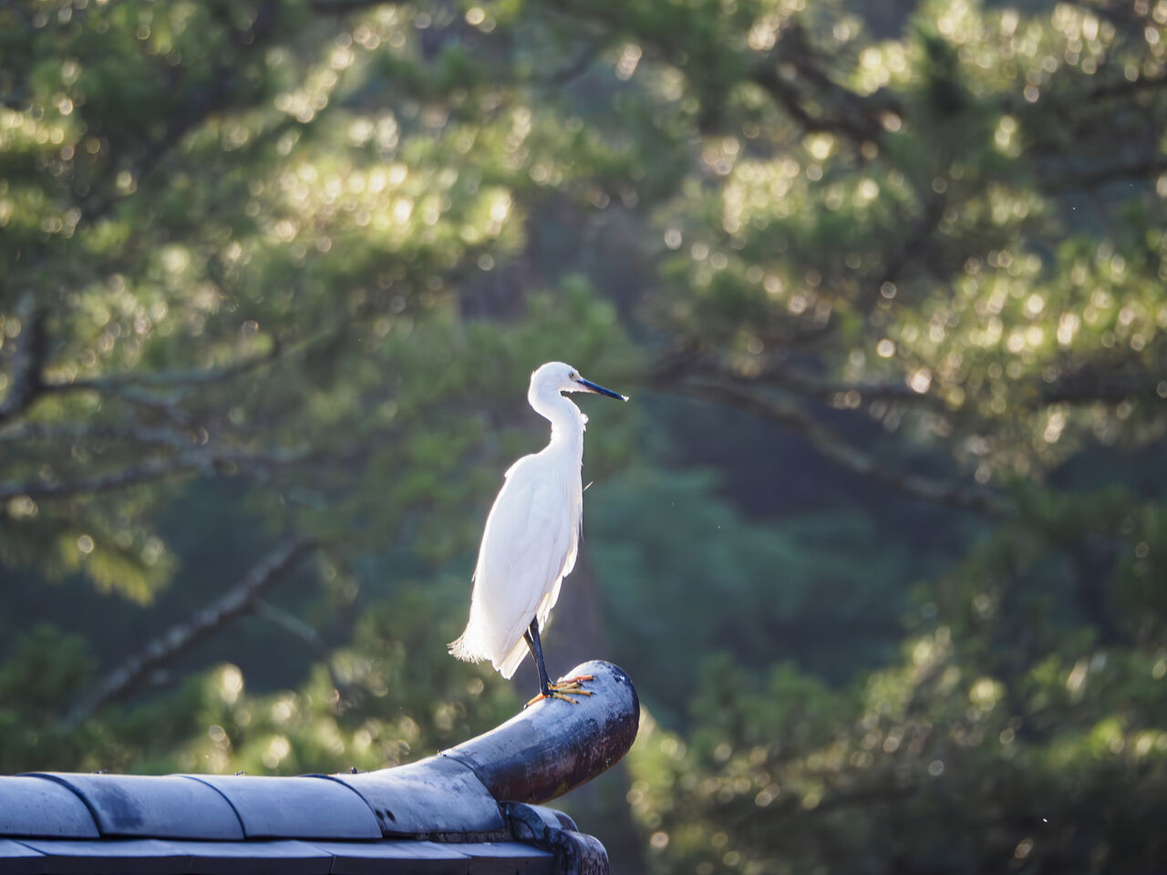 回廊の屋根に鷺